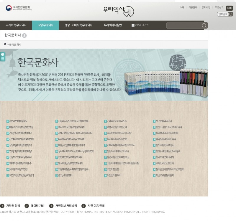 우리 문화와 역사를 더듬어 볼 수 있는 곳 입니다 페이지 정보 박대서쪽지보내기 메일보내기 자기소개 아이디로 검색 전체게시물쪽지보내기 메일보내기 자기소개 아이디로 검색 전체게시물 작성일19-06-23 17:27 조회1,567회 댓글0건 이전글 다음글 목록 본문 한국문화사 - 우리역사넷 - 국사편찬위원회http://contents.history.go.kr/front/km/main.do링크가 안되면 <우리역사넷> 검색하시면 됩니다.도움이 되셨으면 합니다. 댓글목록 등록된 댓글이 없습니다. 이전글 다음글 목록
