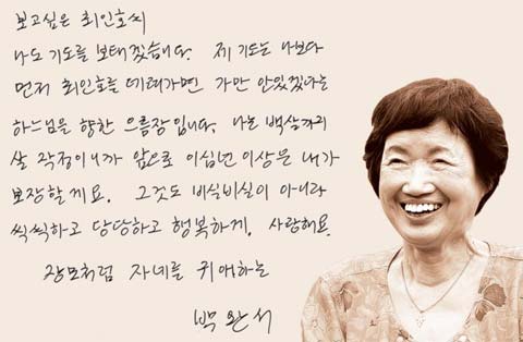 "나도 기도를 보태겠습니다. 제 기도는 나보다 먼저 최인호를 데려가면 가만 안 있겠다는 하느님을 향한 으름장입니다. 나는 백살까지 살 작정이니까 앞으로 이십년 이상은 내가 보장할게요. 그것도 비실비실이 아니라 씩씩하고 당당하고 행복하게. 사랑해요. 장모처럼 자네를 귀애하는, 박완서."