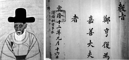 icon_img_caption.jpg 조선 후기 문신 정형복(왼쪽 초상화)을 청백리에 녹선(추천하여 뽑음)했다는 영조의 명을 담은 교지./김문웅씨 제공