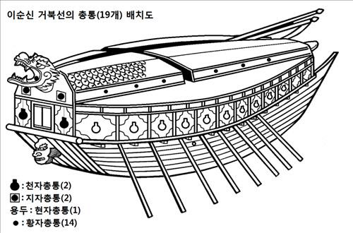 채 교수가 참고한 사료들에 따르면 이순신 장군이 임진왜란 때 사용한 거북선은 3층 구조로 천자총통, 지자총통, 현자총통, 황자총통 등 모두 4종류의 포 19문이 장착돼 있었다. 먼저 용두 뒤에 설치된 현자총통 1문은 거북선의 용머리 윗 부분에 45도 각도로 설치됐는데, 이는 멀리까지 포탄을 발사하기 위해서였다. 또한 296kg으로 무거운 천자총통은 안정성과 발포 시 충격 흡수를 위해 2층 전면에 2문이 배치됐고, 상대적으로 가벼운 지자총통은 3층 전면에 2문이 배치됐다고 채 교수는 주장했다.